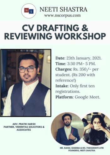 Keeping that in mind, we are organising an exclusive CV DRAFTING & REVIEWING WORKSHOP in collaboration with Advocate Pratik Harsh, Partner, Vidhinyas Solicitors & Associates.